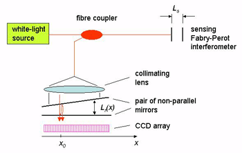 例如,干涉儀由兩個非平行的鏡子組成,以透射方式工作。可以看出,氣隙Lr(x)取決于沿鏡子的位置x,并且在位置x0處產生最大干涉信號,其中Lr(x0)與傳感干涉儀的間隙Ls精確匹配。該位置x0很容易由安裝在鏡子后面的CCD陣列確定。